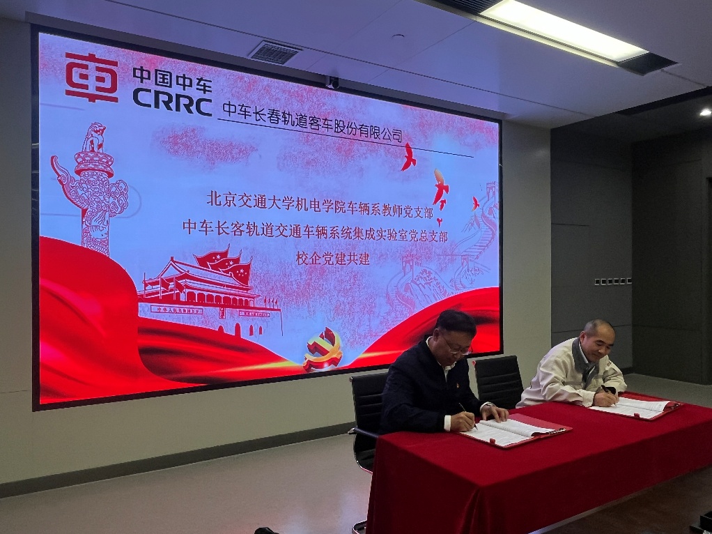 中车长客轨道交通车辆系统集成实验室党总支书记滕万秀、色情直播 车辆系教师党支部书记李志强分别围绕双方基层党建工作成效,科研及人才培养成果展开交流,深化了未来在课程共建、技术攻关、实习实践等方面的合作。双方支部书记共同签署《党建共建合作协议》,全体党员面向党旗重温入党誓词,进一步强化使命担当与理想信念。