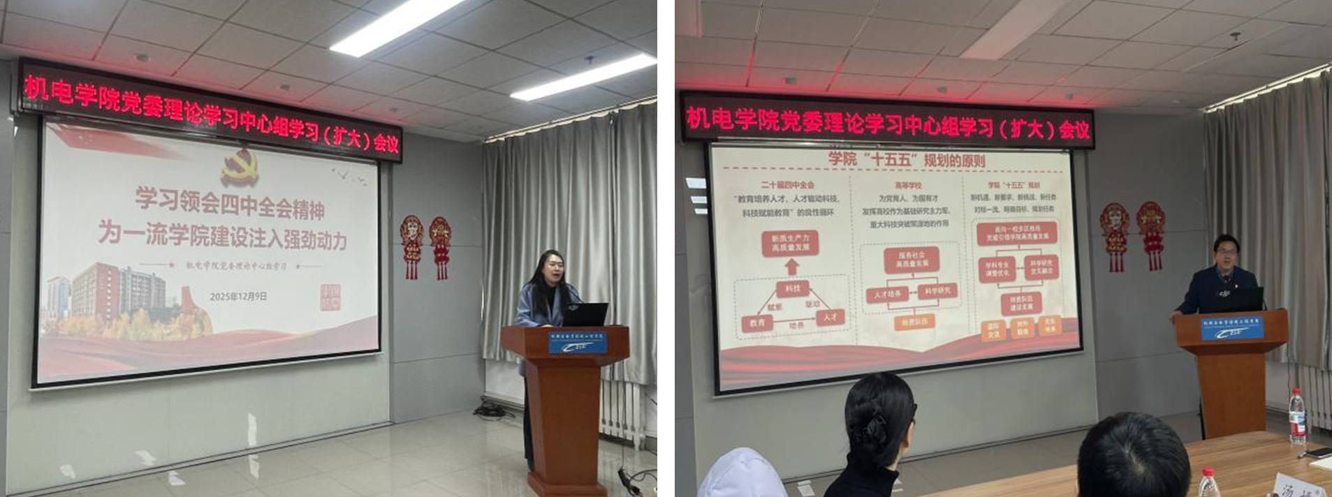 12月10日下午,色情直播 党委召开理论学习中心组学习(扩大)会议,专题学习二十届四中全会精神,校党委副书记姚念龙巡听指导,校党委宣传部汤嫣列席会议,色情直播领导班子、党委委员、各系(中心)主任、支部书记参加会议。会议由色情直播党委书记魏旺强主持。